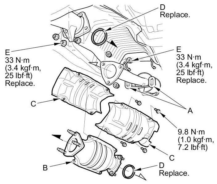 Install the parts in the reverse order of removal with new gaskets (D) and new self-locking nuts (E).