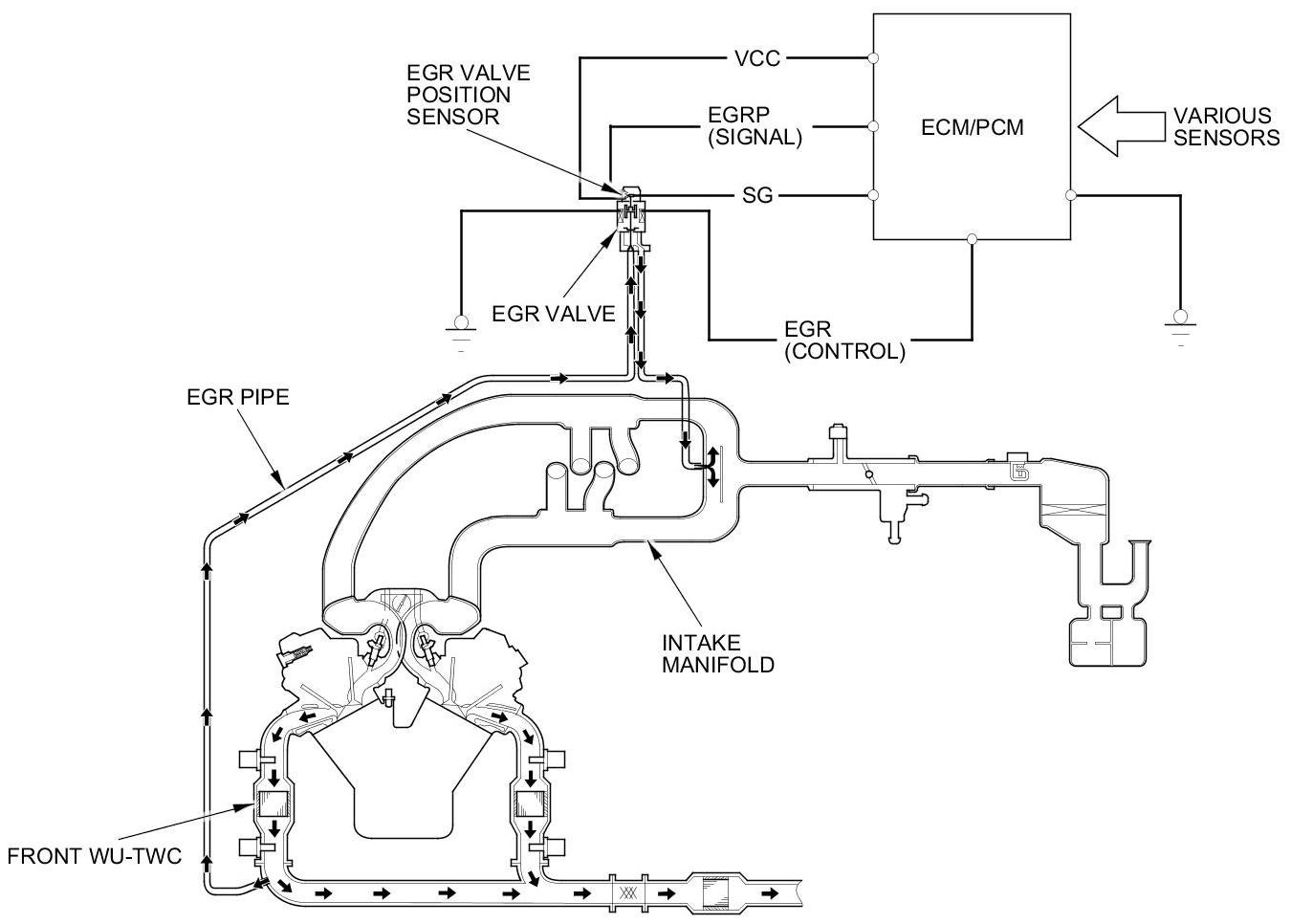 The EGR system reduces oxides of nitrogen (NOx) emissions by recirculating exhaust gas through the EGR pipe to the intake manifold, and into the combustion chambers. Routing the exhaust gas through the EGR pipe helps to prevent carbon deposits from forming in the intake manifold and the throttle body. The ECM/PCM memory includes the ideal EGR valve position for varying operating conditions.