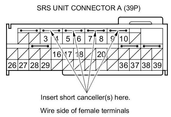 Terminal numbers are shown on the wire side of the female terminals. Insert the SRS short canceller(s) into the cavities on the terminal side of the connector.