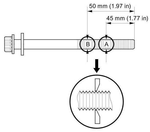 Measure the diameter of each cylinder head bolt at point A and point B.