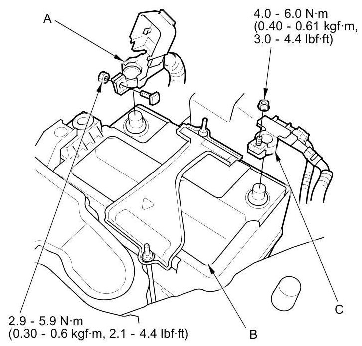 3. Reconnect the positive cable (A) to the battery (B) first, then reconnect the negative cable (C) to the battery.