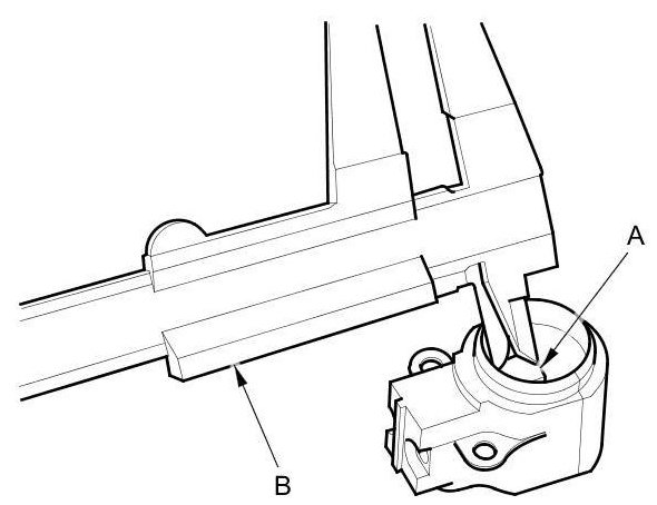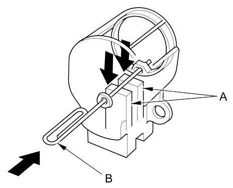 19. Push the brushes (A) in, then insert a pin or drill bit (B) (about 1.6 mm (1/16 in) diameter) to hold them there.