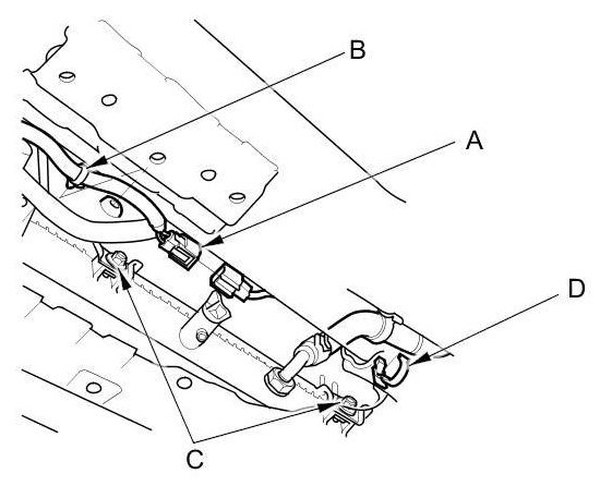 12. Remove the harness clamp (C) from the alternator and disconnect the A/C compressor clutch connector (D) from the A/C compressor.
