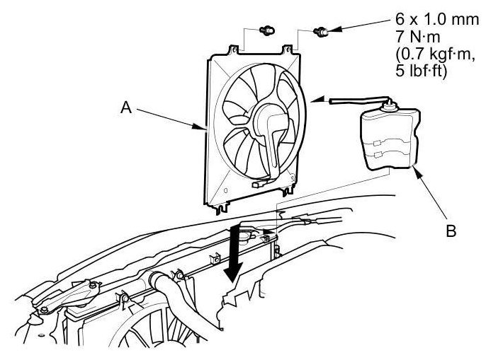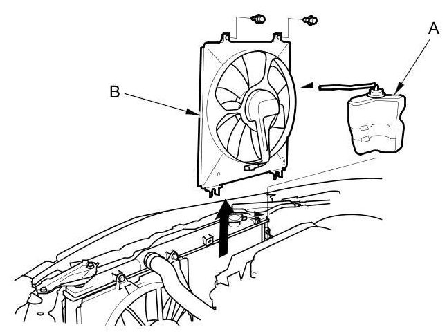 6. Install the A/C condenser fan shroud assembly (A), then install the coolant reservoir (B).
