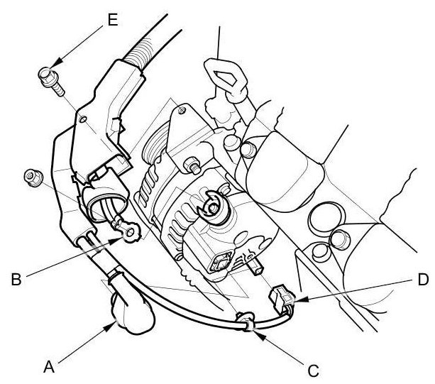 4. Connect the alternator connector (D) and the positive alternator cable (E) to the alternator. Make sure the crimped side of the ring terminal faces away from the alternator when you connect it.