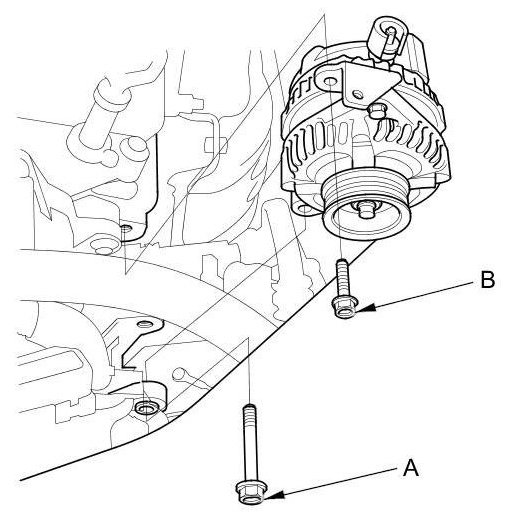 14. Remove the mounting bolt (A) and the alternator bracket mounting bolt (B), then remove the alternator.