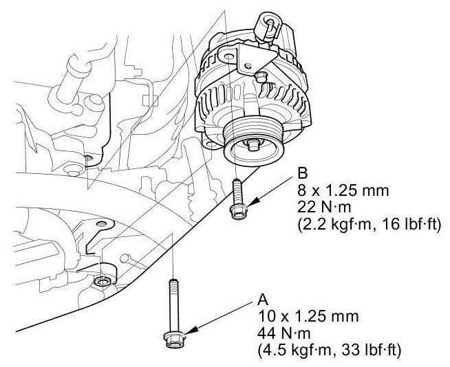 1. Install the alternator, then tighten the mounting bolt (A) and the alternator bracket mounting bolt (B).