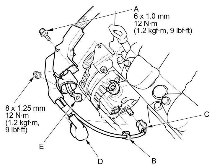 3. Install the harness clamp (B) to the alternator and connect the A/C compressor clutch connector (C) to the A/C compressor.