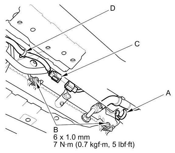 10. Connect the A/C condenser fan motor connector (C), and install the harness clamp (D).