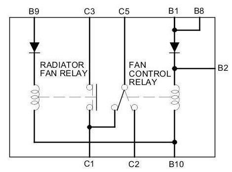 There should be continuity between terminals C2 and C5 when battery power is connected to terminal B1 (, B2 or B8), and battery ground is connected to terminal B10. There should be continuity between terminals C1 and C5 when power is disconnected.