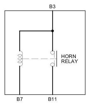 There should be battery voltage at terminal B11 when battery power is connected to terminal B3, and battery ground is connected to terminal B7. There should be no continuity between terminals B3 and B11 when power is disconnected.