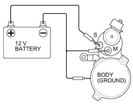 6. Connect the battery as shown. Make sure you disconnect the starter motor wire from the M terminal. If the starter pinion moves out, it is working properly.