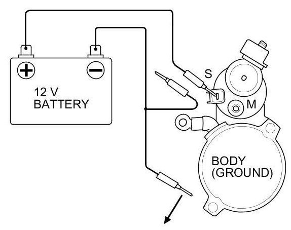 7. Disconnect the battery from the M terminal. If the pinion does not retract, the hold-in coil of the solenoid is working properly.