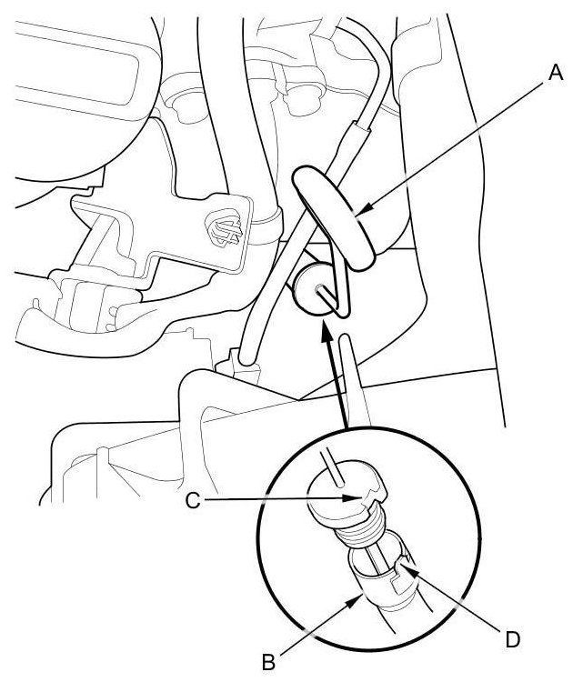 4. Insert the dipstick back into the dipstick guide tube (B) aligning the notch (C) with the guide tab (D).