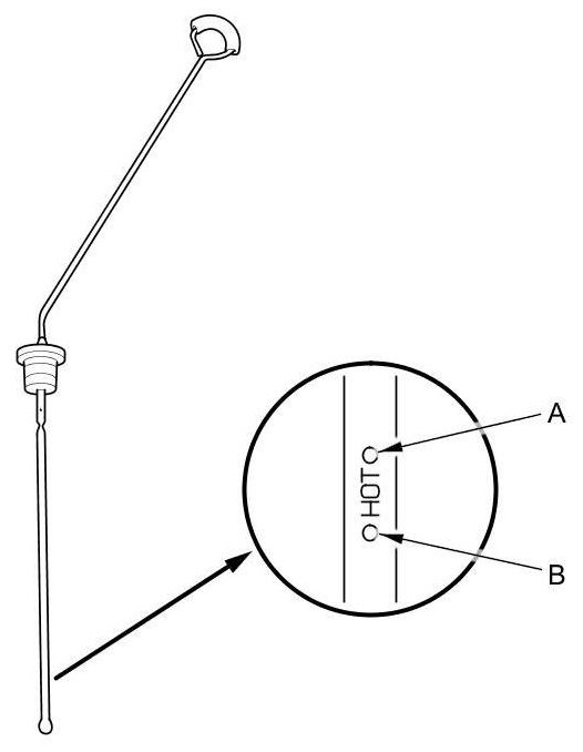 5. Remove the dipstick and check the fluid level. It should be between the upper mark (A) and the lower mark (B).