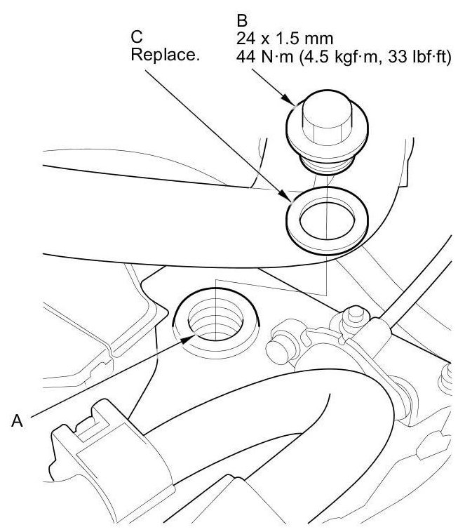 9. Install the ATF filler bolt (B) with a new sealing washer (C).