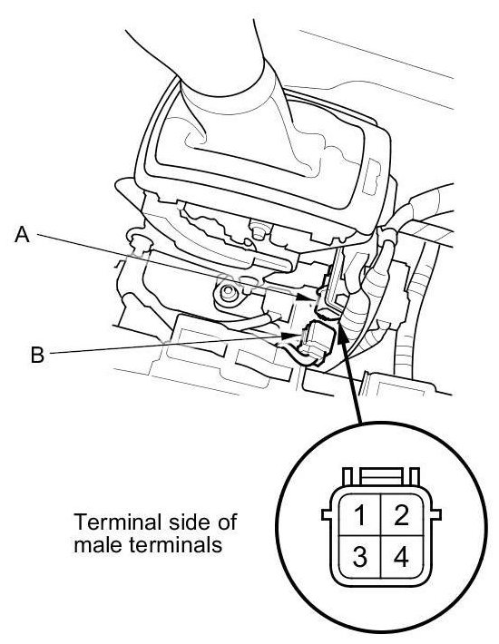 2. Disconnect the A/T shift lock solenoid/park pin switch 4P connector (A) from the park pin switch (B).