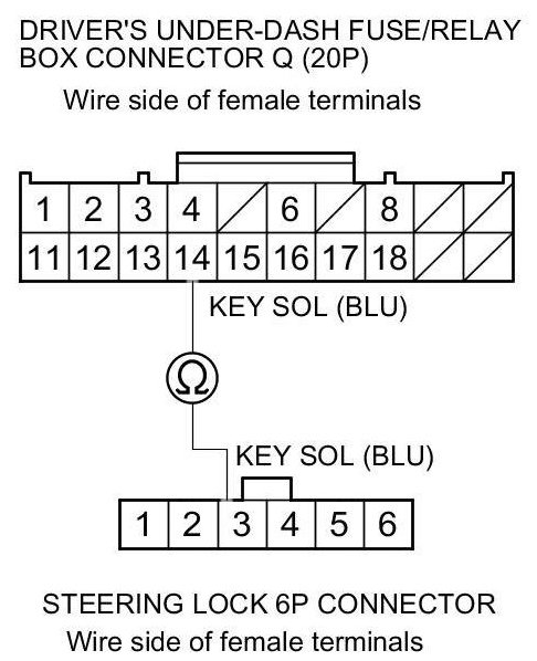 11. Check for continuity between driver's under-dash fuse/relay box connector Q (20P) terminal No. 14 and steering lock 6P connector terminal No. 3.