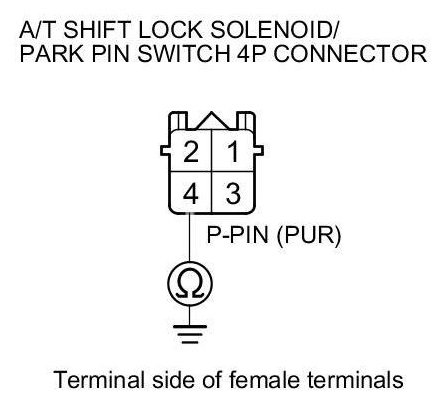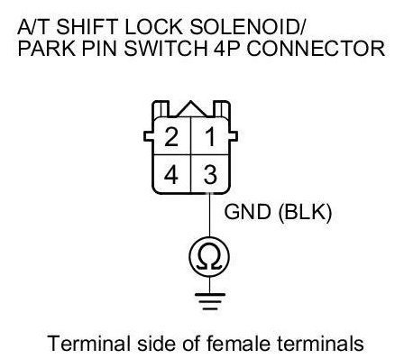 16. Check for continuity between A/T shift lock solenoid/park pin switch 4P connector terminal No. 4 and body ground.
