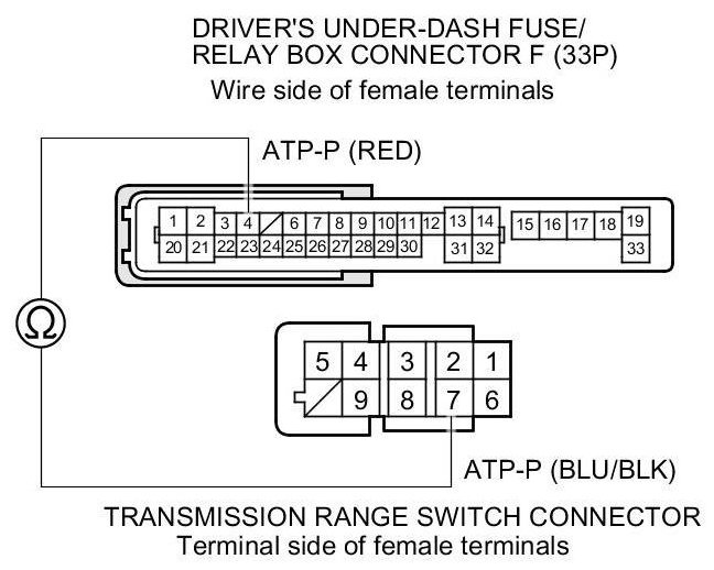 21. Check for continuity between driver's under-dash fuse/relay box connector F (33P) terminal No. 4 and transmission range switch connector terminal No. 7.