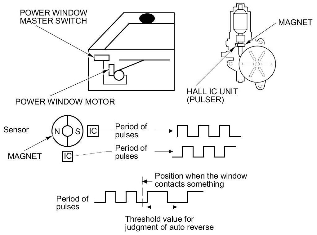 The driver's and front passenger's power window motors incorporate a Hall IC unit (pulser) which generates pulses during the motor's operation and sends pulses to the driver's and passenger's power window control units. As soon as the power window control units detect a change in the pulse frequency from the Hall IC unit (pulser), the power window control units make the power window motor stop and reverse. This prevents pinching your hand or fingers during auto-up operation. The auto reverse function does not work when the power window master switch is held in the closed position.
