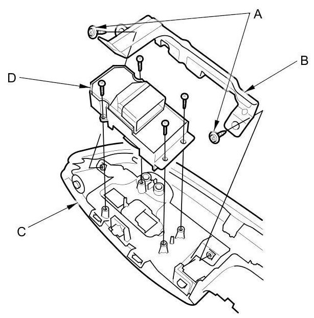 2. Remove the two screws (A), then remove the bracket (B) from the armrest assembly (C).