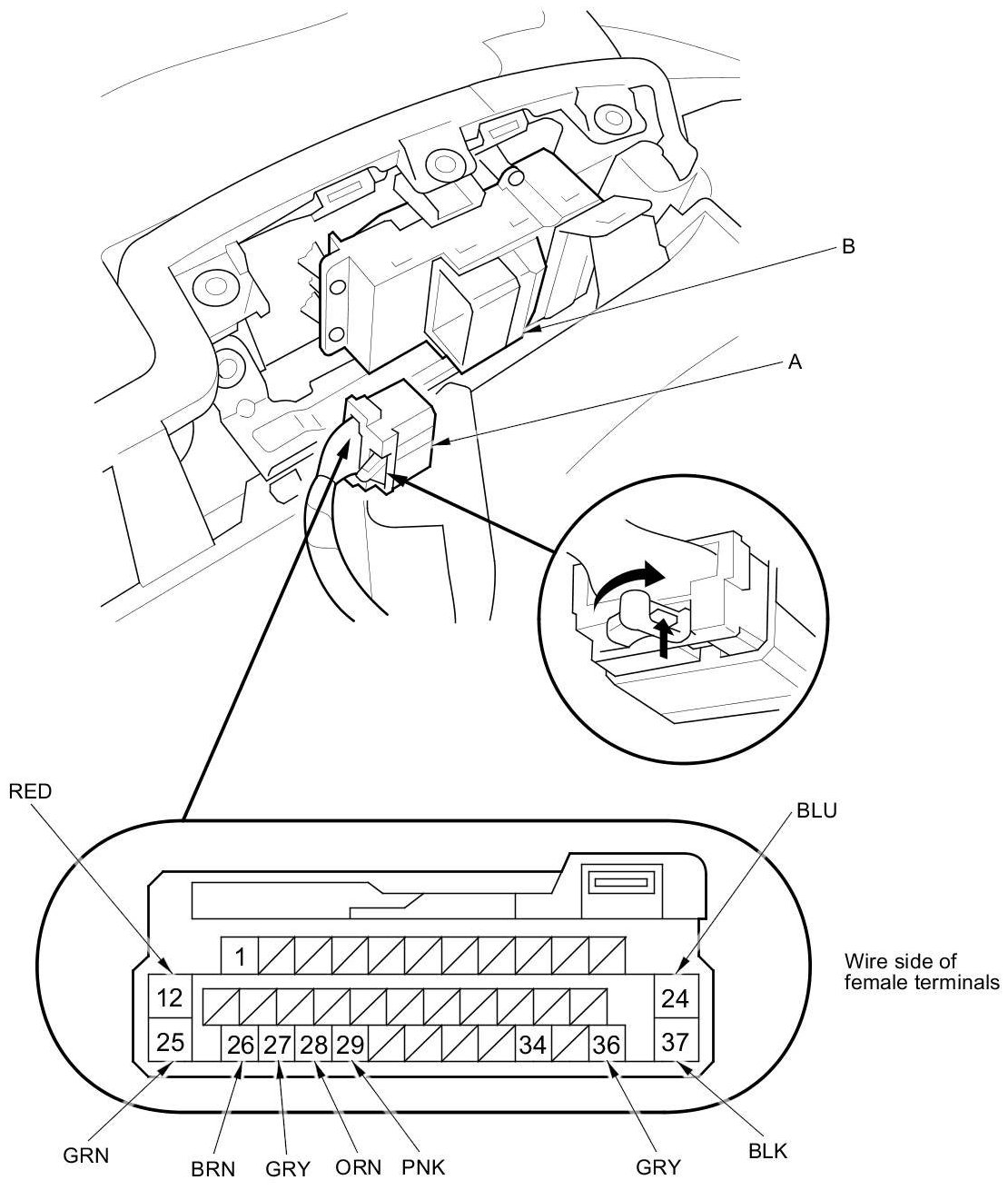 3. Disconnect the front passenger's power window switch 37P connector (A) from the front passenger's power window switch (B).