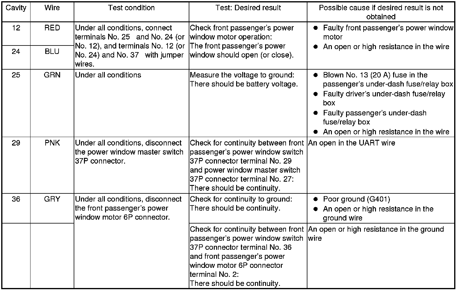 - If all the input tests prove OK, replace the front passenger's power window switch Front Passenger's Power Window Switch Replacement.