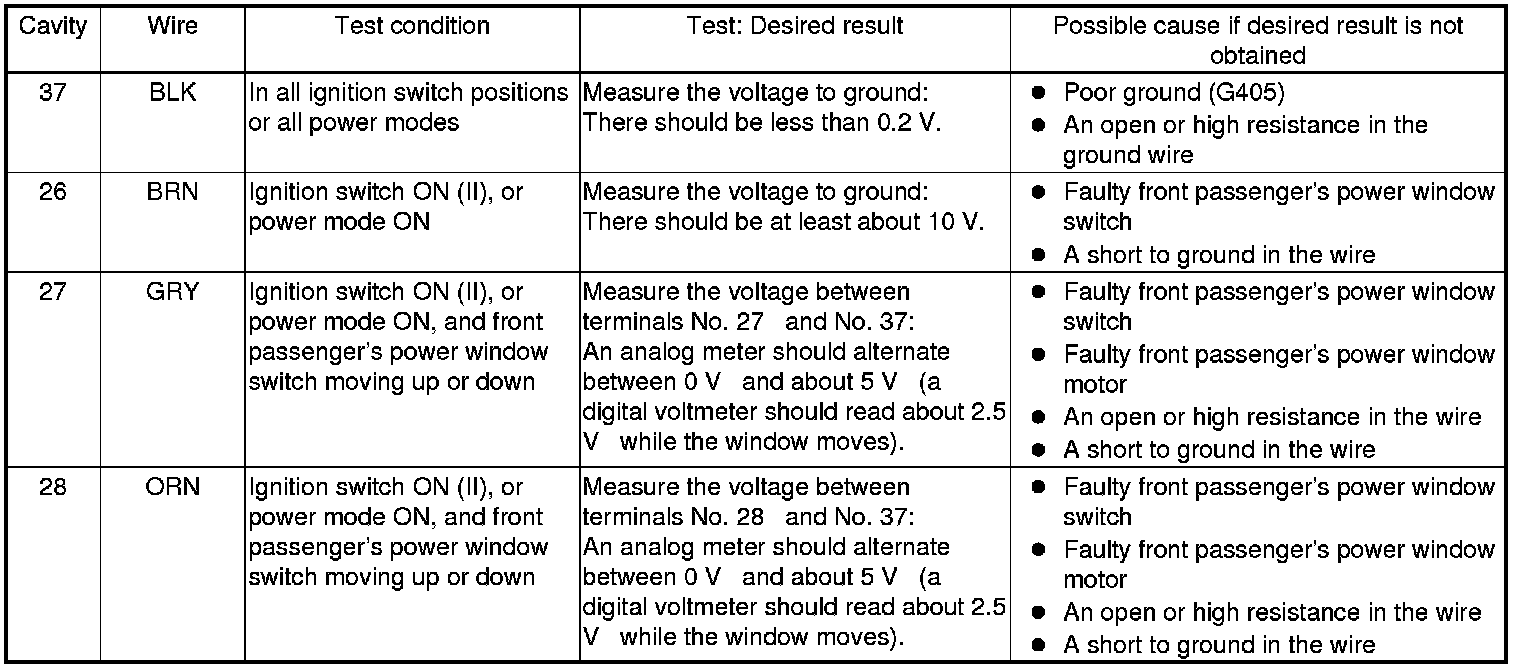 6. Reconnect the connector to the front passenger's power window switch, turn the ignition to ON(II), or press the engine start/stop button to select the ON mode, and do the following input tests: