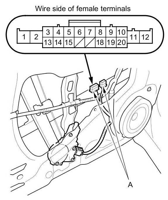 1. Remove the driver's door panel Front Door Panel Removal / Installation, and disconnect the driver's door wire harness connectors (A) from the driver's door subharness.
