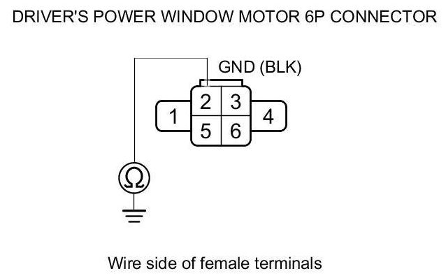 7. Check for continuity between driver's power window motor 6P connector terminal No. 2 and body ground. There should be continuity.
