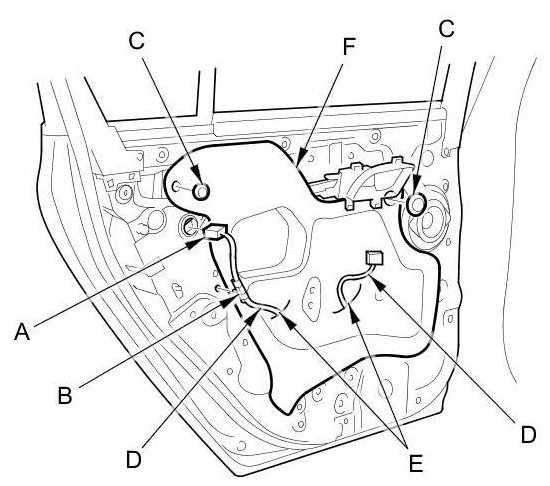 16. Remove the bolts (C), and loosen the bolt (D). Release the hook (E), then remove the regulator through the hole in the door.