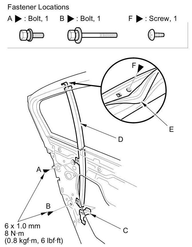 8. Remove the bolts (A, B) and the collar (C) from the rear lower channel (D). Pull away the door weatherstrip (E) as needed, and remove the screw (F).