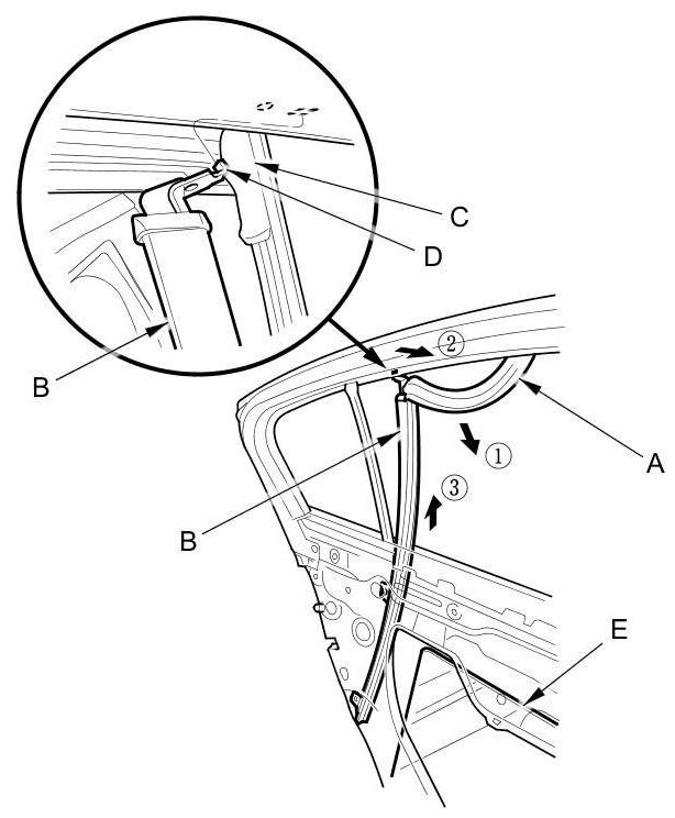 9. Pull away the glass run channel (A) as needed. Pull the rear lower channel (B) forward from the quarter glass seal (C), then release the upper hook (D) from the door. Remove the rear lower channel from the door glass (E), then pull up the channel to remove it.