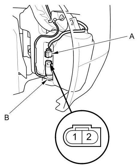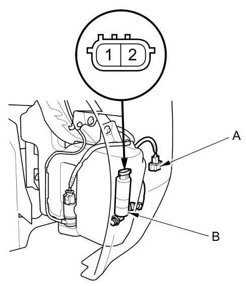 2. Disconnect the 2P connector (A) from the windshield washer motor (B).