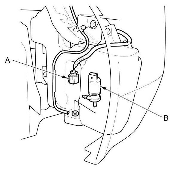 2. Disconnect the 2P connector(s) (A) from the windshield washer motor (B), washer fluid level switch (Canada models), and the headlight washer motor (with headlight washer).