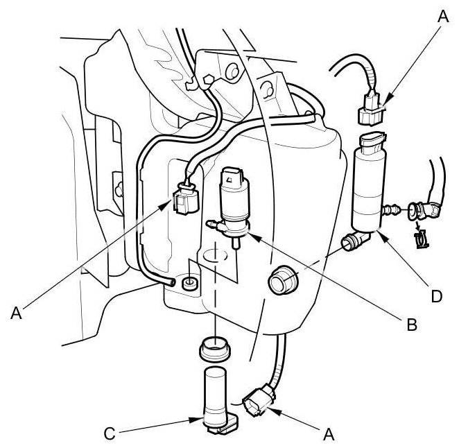 3. Disconnect the washer tube(s), then if necessary, remove the washer motor, the washer fluid level switch (C) (Canada models), and the headlight washer motor (D) (with headlight washer).
