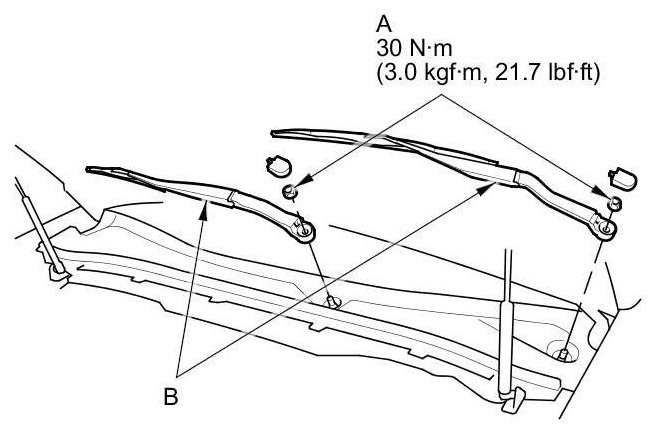 1. Open the hood. Remove the cap, nuts (A), and the windshield wiper arms (B).