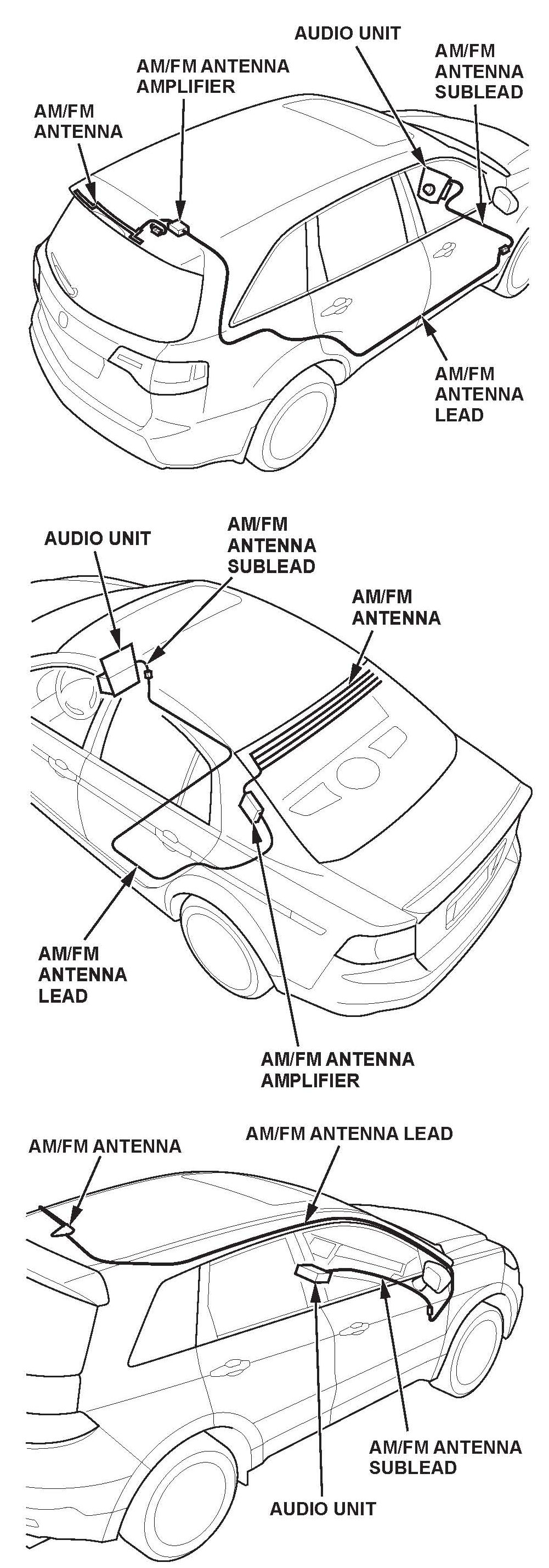 ^ Refer to the illustrations for the names and general locations of the AM/FM antenna and its parts. These images are examples only. Refer to the applicable service manual for model-specific information.