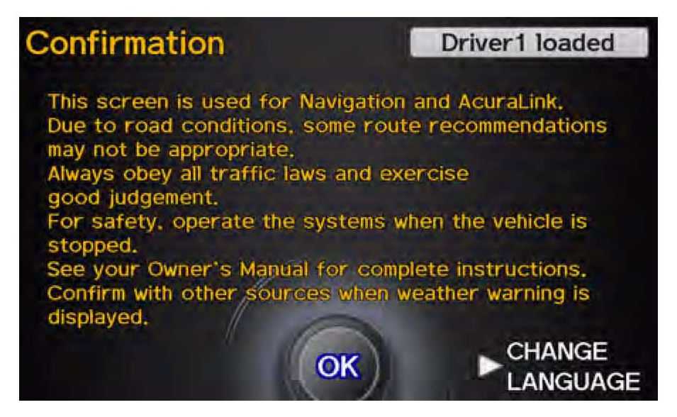 2. On the navigation system disclaimer screen, select OK by pressing the interface dial. (The interface dial is used to control several functions, including AcuraLink.)