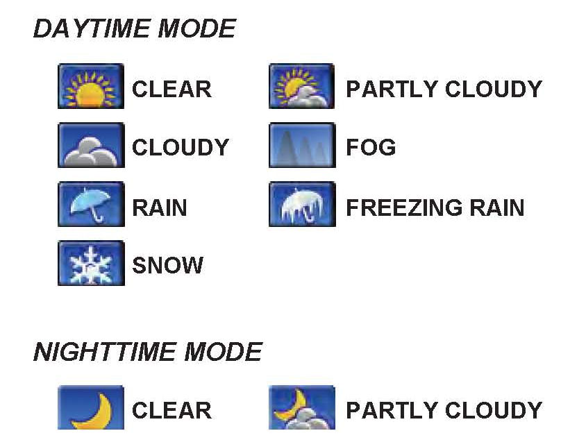 AcuraLink Real-Time weather shows current local weather as weather icons on the map screen. These are different from weather related traffic incident icons. Here are examples of the weather icons:
