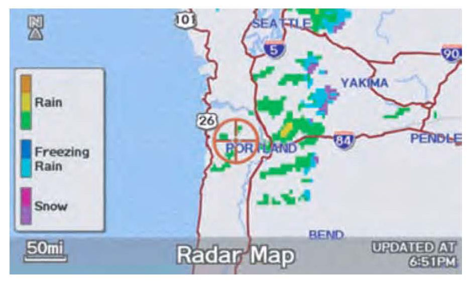 To see the weather radar image map, say or select Radar Map. The display changes to show the weather radar image map for the selected area.