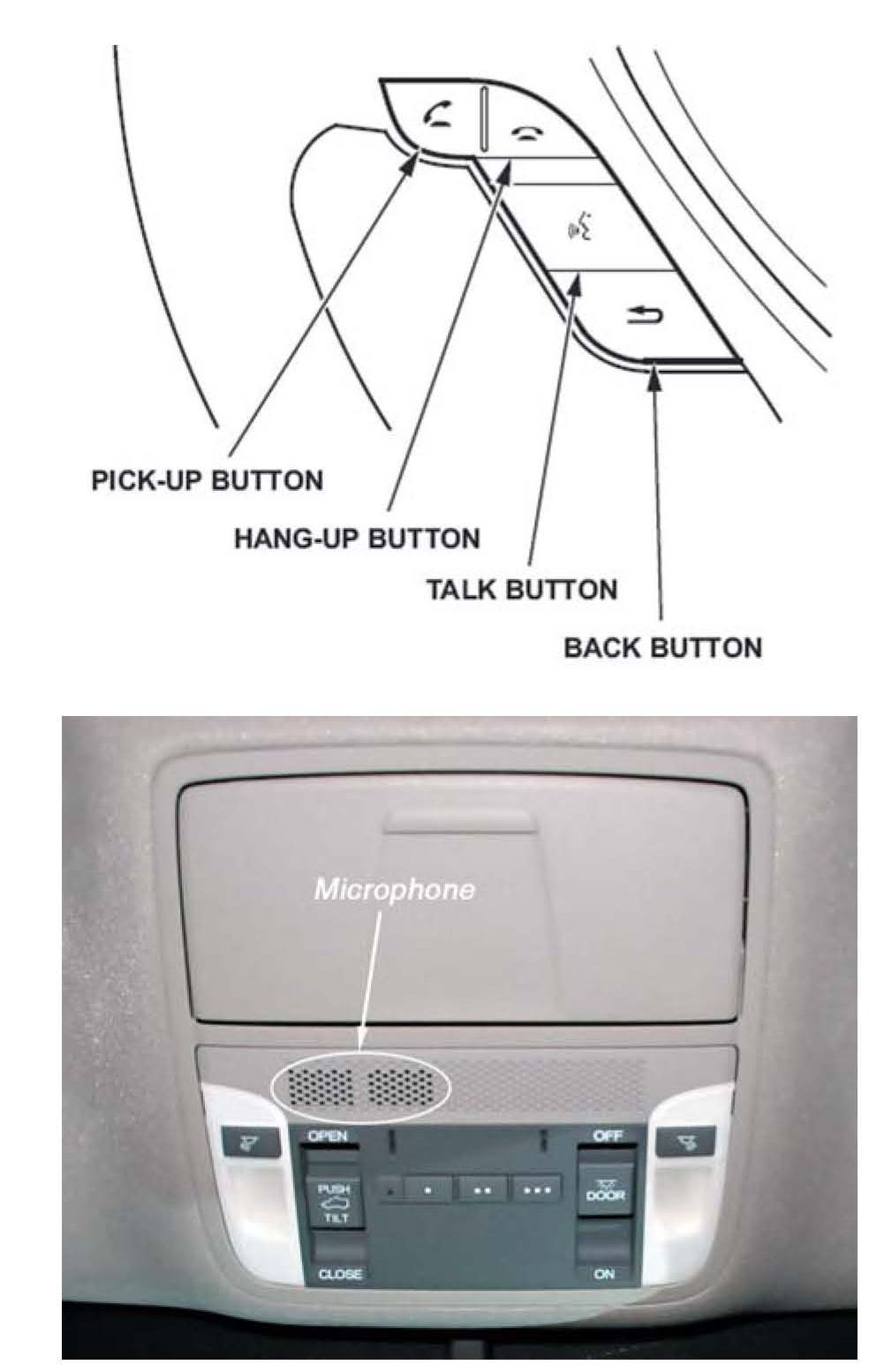 BACK button - Press this button to return to the previous screen. After the previous screen appears, the system prompts you for a command, and beeps. Press and release the TALK button to say your next command. The BACK button has the same function as the CANCEL button located next to the interface dial. Microphone - Receives voice commands.