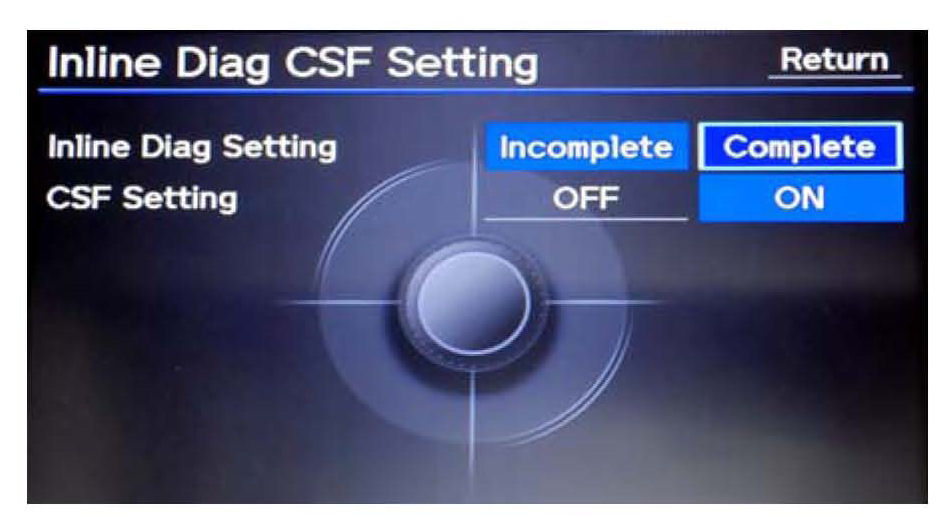 ^ Set the Inline Diag Setting to Complete, and make sure the CSF Setting is ON, then select Return twice to exit the diagnostic mode.