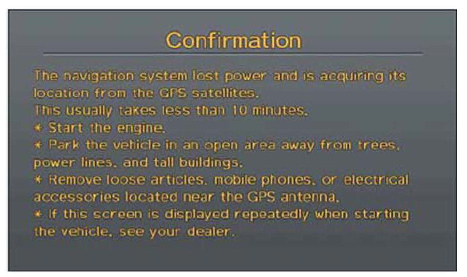5. If the system does not initialize within 10 minutes, a second screen (shown) appears. The system is still initializing but will not automatically exit to the disclaimer screen when the initialization is complete. Do not immediately follow the instructions on the screen. After 30 minutes, try restarting the engine to see if the navigation system completed the initialization. If it did not, follow the instructions on the screen.