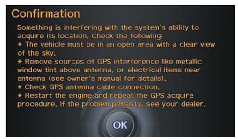 The initialization screen may appear after battery voltage to the navigation control unit has been disconnected for more than 5 minutes. If this happens, follow the on-screen instructions. If you are still unable to obtain GPS initialization, refer to the service manual for diagnostic information.
