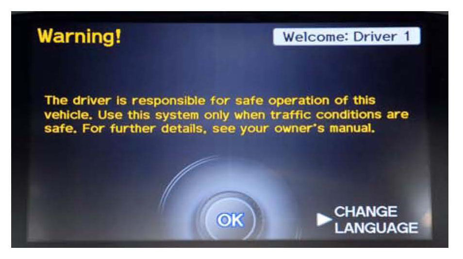 2. On the navigation system disclaimer screen, select OK by pressing the interface dial. (The interface dial is used to control several functions, including AcuraLink.)