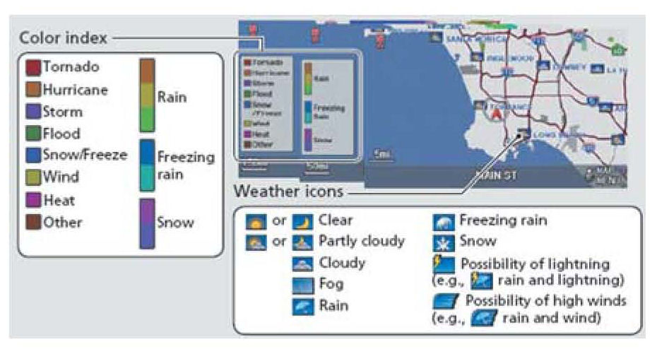 XM Radio now offers XM weather and radar that shows current local weather as weather icons on the map screen. These are different from weather-related traffic incident icons. The weather icons are: