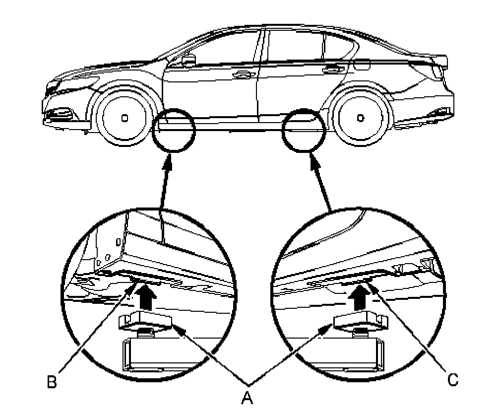 1. Position the lift pads (A) under the vehicle's front support points (B) and rear support points (C).
