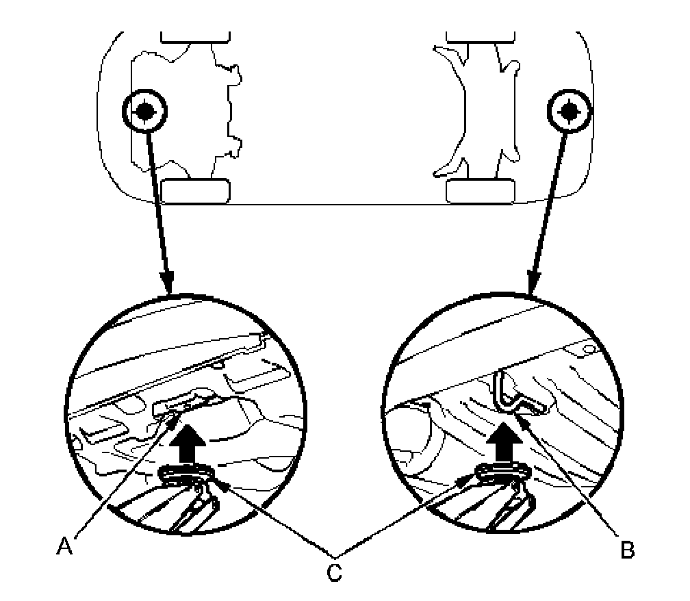 3 Position the floor jack under the front jacking bracket (A) or the rear jacking bracket (B). Center the jacking bracket on the jack lift platform (C), and jack up the vehicle high enough to fit the safety stands under it.